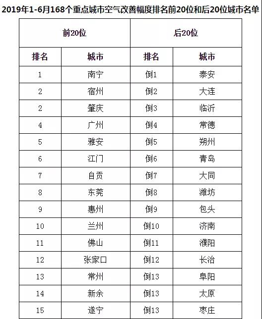 從空氣質(zhì)量同比改善程度看,2019年1-6月,168個(gè)重點(diǎn)城市中南寧、宿州、肇慶市等20個(gè)城市空氣質(zhì)量改善幅度相對(duì)較好(從第1名到并列第19名);泰安、大連、臨沂市等20個(gè)城市空氣質(zhì)量改善幅度相對(duì)較差(從倒數(shù)第1名到倒數(shù)第20名,見附表3)。